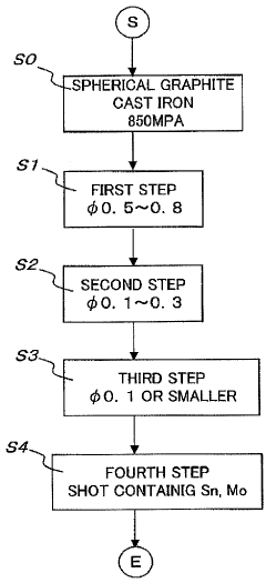 - A method involving multiple shot peening treatments with specific hardness and particle size shots, followed by normalization heat treatment, to enhance the fatigue strength of spherical graphite cast iron to match that of carburized and hardened steel materials, without the need for carburizing and hardening processes.