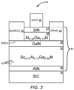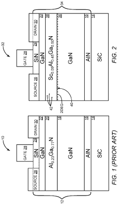 Advanced fabrication techniques are essential for producing high-accuracy GaN HEMTs. These include precise epitaxial growth methods, improved lithography processes, and controlled etching techniques. Molecular beam epitaxy and metal-organic chemical vapor deposition with in-situ monitoring enable atomic-level control of layer thickness and composition. Enhanced lithography and etching processes minimize dimensional variations and reduce defect density, resulting in more uniform device characteristics and improved accuracy in high-frequency applications.Expand Specific Solutions03 Thermal management solutions for stable GaN HEMT operation