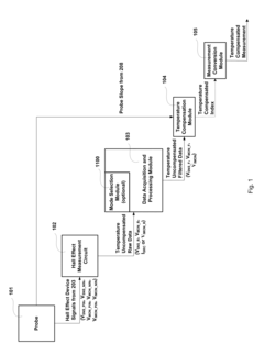 Technical Solution: Honeywell has developed advanced temperature compensation techniques for Hall Effect sensors that maintain signal stability across wide temperature ranges (-40°C to +150°C). Their proprietary SMART (Self-calibrating, Magnetoresistive, Auto-compensated, Range-extendable Technology) platform incorporates integrated temperature sensors and digital signal processing algorithms that continuously adjust sensor output based on real-time temperature measurements[1]. The system employs a dual-element sensing architecture where one element serves as a temperature reference while the other performs the primary magnetic field measurement, allowing for dynamic compensation. Honeywell's sensors feature chopper stabilization techniques that reduce temperature-induced offset drift to less than 0.02%/°C[3], significantly outperforming conventional Hall sensors. Additionally, their sensors incorporate custom ASIC designs with embedded temperature lookup tables that apply calibration coefficients across the operating temperature range, ensuring linearity better than ±0.5% full scale[5].