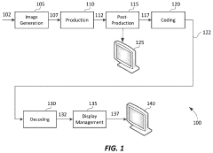 Technical Solution:  Dolby Vision employs a sophisticated dynamic metadata approach that optimizes content on a frame-by-frame basis, utilizing a 12-bit color depth system capable of displaying up to 68.7 billion colors. The technology implements perceptual quantization (PQ) EOTF (Electro-Optical Transfer Function) which more closely matches human visual perception than traditional gamma curves. Dolby's proprietary algorithm analyzes each frame to determine optimal brightness, contrast, and color settings, with metadata carrying precise instructions for how each scene should be displayed. This dynamic mapping allows content to be optimized for the specific capabilities of each display device, maintaining creative intent across various hardware specifications. Dolby Vision IQ further enhances this capability by incorporating ambient light sensors to adjust HDR performance based on viewing environment conditions[1][3].