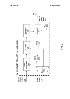 - 05 Compression and bandwidth optimization for HDR contentSpecialized compression algorithms and bandwidth optimization techniques for HDR10 and Dolby Vision content. These methods address the increased data requirements of HDR formats while maintaining visual quality. The techniques include adaptive bit allocation, perceptual quantization, and efficient encoding of HDR-specific metadata to enable transmission over limited bandwidth channels while preserving the enhanced dynamic range and color information.Expand Specific Solutions