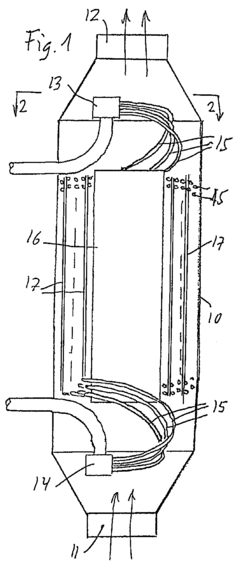 Technical Solution: Praxair has pioneered advanced plate-fin heat exchangers (PFHE) for cryogenic applications, featuring aluminum construction with brazed joints capable of withstanding extreme temperature differentials. Their proprietary designs incorporate specialized fin geometries that enhance heat transfer while minimizing pressure drop, achieving effectiveness values exceeding 98% in many applications. Praxair's cryogenic heat exchangers utilize multi-stream capabilities, allowing up to 12 process streams to exchange heat within a single unit, significantly reducing footprint and capital costs. Their technology includes specialized distribution systems that ensure uniform flow across the entire heat transfer matrix, preventing localized freezing and flow instabilities common in cryogenic operations. Praxair's heat exchangers incorporate robust mechanical design features to handle thermal cycling between ambient and cryogenic temperatures without compromising structural integrity.