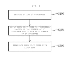 - A method involving a glass frit paste applied to the peripheral portions of two substrates, with one substrate being smaller than the other, and irradiating the paste directly with a CO2 laser beam to achieve hermetic sealing, while using additives like V2O5, carbon powder, or carbon nanotubes to enhance bondability and applying a spacer to maintain distance, and optionally coating with epoxy or acrylic resin for improved reliability.