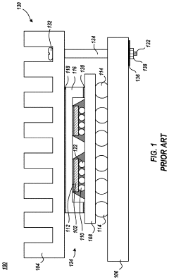 Technical Solution: Intel has developed advanced heterogeneous integration thermal management solutions focusing on three key areas. For hot-spot sharing, they've implemented embedded silicon bridges and EMIB (Embedded Multi-die Interconnect Bridge) technology that distributes heat more evenly across the package. Their TIM (Thermal Interface Material) strategy employs Indium-based solders and polymer matrix composites with high thermal conductivity (>5 W/mK) specifically engineered for high-performance computing applications. Intel's microfluidic cooling solution integrates directly into the silicon interposer, with microchannels etched into the substrate allowing coolant to flow within microns of the heat source. Their recent developments include two-phase cooling systems that utilize the latent heat of vaporization to achieve cooling power densities exceeding 1000 W/cm² in laboratory settings, addressing thermal challenges in their most advanced heterogeneous packages.