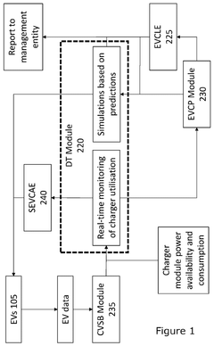 - A method utilizing a digital twin of the EV charging network to monitor and manage charger module utilization, predict future demands, simulate scenarios, and generate reports for optimized charger deployment and EV allocation, ensuring efficient power usage and minimizing risks like power crashes or shortages.