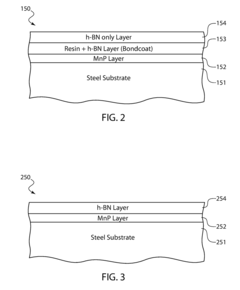Technical Solution: 3M has developed a proprietary h-BN coating system marketed under their Boron Nitride Solutions portfolio. Their technology utilizes a unique spray-application method combined with post-deposition thermal processing to create firmly adhered h-BN coatings. The company has engineered a binder system that maintains integrity at high temperatures while allowing the h-BN platelets to maintain their natural lubricity. Their coatings incorporate proprietary surface functionalization of h-BN particles to enhance dispersion stability and adhesion to various substrates. 3M's research demonstrates that their coatings maintain a friction coefficient below 0.2 even after 1000 hours of operation at 750°C in oxidizing environments[3]. The company has also developed specialized formulations for different industrial applications, including versions optimized for metal forming, glass manufacturing, and automotive components. Their technology includes self-replenishing mechanisms where new lubricant layers are continuously exposed as wear occurs, extending effective coating lifetime.