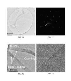 Hexagonal boron nitride exhibits excellent tribological properties including low friction coefficient and high wear resistance. When used as a coating or film, h-BN provides self-lubricating properties that significantly reduce friction between contacting surfaces. The layered structure of h-BN allows for easy shearing between atomic planes, contributing to its effectiveness as a solid lubricant for long-term wear applications under various operating conditions.Expand Specific Solutions03 Counterface material interactions with h-BN films