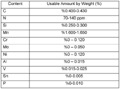 - A high-strength micro-alloyed steel composition with specific elemental ratios and a controlled cooling process, utilizing vanadium as the sole carbide builder, aluminum for deoxidation, and nitrogen for nitride formation, combined with solid melt hardening and grain refinement, to achieve enhanced mechanical properties without compromising weldability.