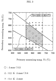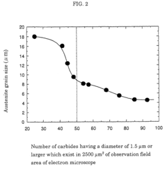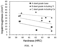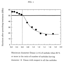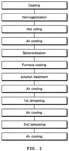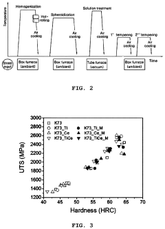 Technical Solution: Daido Steel has developed a comprehensive matrix for selecting between high carbon and tool steel for cutting applications based on workpiece hardness, cutting speed, and environmental conditions. Their SKH series high-speed tool steels incorporate precise amounts of tungsten, molybdenum, vanadium, and cobalt to optimize performance in high-temperature cutting operations. For applications requiring extreme wear resistance, their SKD series cold work tool steels feature carefully controlled carbon content (typically 0.85-1.55%) and chromium (5-12%) to balance hardness and toughness. Daido's research has demonstrated that their specially formulated tool steels can maintain hardness at temperatures up to 600°C, significantly outperforming high carbon steels which typically begin to lose hardness above 200°C[3]. Their technical approach includes specialized heat treatment protocols that optimize the microstructure for specific cutting applications, with particular attention to carbide size and distribution.