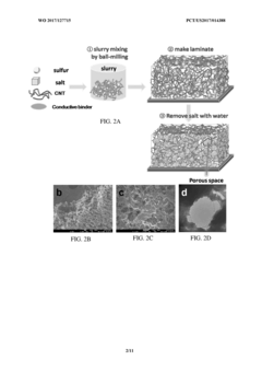 Functional interlayers and modified separators are designed to physically block or chemically bind polysulfides that dissolve from high-loading sulfur cathodes. These components are positioned between the cathode and anode to prevent polysulfide shuttling, which is particularly problematic with increased sulfur content. Materials used include carbon-based films, polymer coatings with functional groups, or inorganic barriers that selectively allow lithium ion transport while blocking larger polysulfide molecules.Expand Specific Solutions05 Binder systems for high sulfur loading electrodes