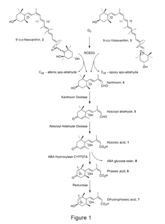 Research into the molecular mechanisms of abscisic acid signaling in plants, including receptor identification, signal transduction pathways, and gene expression regulation. Understanding these processes helps in developing targeted approaches for manipulating plant responses to environmental stresses.Expand Specific Solutions05 Formulations and delivery systems for abscisic acid