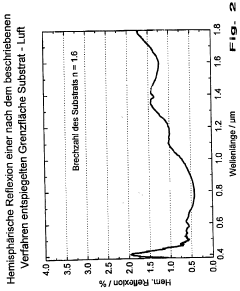 Technical Solution: SCHOTT has developed a hybrid sol-gel technology for anti-reflective coatings on plastic substrates that addresses the critical balance between hardness and optical performance. Their approach utilizes organically modified ceramic materials (ORMOCER®) that combine the durability of inorganic materials with the flexibility of organic compounds. The coating process begins with a nano-composite primer layer that enhances adhesion to various plastic substrates including polycarbonate and PMMA. This is followed by multiple functional layers with precisely controlled porosity to create a gradient refractive index profile. SCHOTT's proprietary formulation incorporates silica nanoparticles (15-25nm diameter) dispersed in a modified siloxane matrix, creating a structure that minimizes light scatter while providing mechanical stability. The coating is cured using a combination of thermal and UV processes that promote cross-linking without damaging the substrate. This results in coatings with pencil hardness ratings of 2H-4H while maintaining reflection values below 0.8% across the visible spectrum. The technology has been successfully implemented in automotive displays, optical sensors, and consumer electronics applications[4][6].