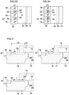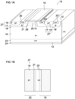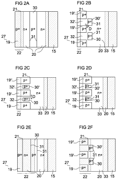 Effective thermal management is crucial for SiC MOSFETs to ensure long-term reliability and performance. Despite their ability to operate at higher temperatures than silicon devices, SiC MOSFETs still require specialized packaging, heat dissipation techniques, and thermal interface materials. Advanced cooling solutions and package designs help maintain optimal junction temperatures during high-power operation. Reliability enhancement methods include specialized passivation layers, edge termination structures, and stress relief features that address the unique failure mechanisms in SiC power devices.Expand Specific Solutions05 Circuit integration and system applications