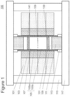 Technical Solution: Element Six has pioneered advanced autoclave synthesis techniques for diamond growth, utilizing High Pressure High Temperature (HPHT) processes operating at approximately 5-6 GPa and temperatures exceeding 1400°C. Their proprietary technology employs carefully controlled metal catalysts (typically Fe, Ni, Co alloys) within sealed autoclave chambers to create an environment where carbon dissolves and precipitates as diamond. Element Six's process incorporates precise temperature gradient control systems that maintain optimal supersaturation conditions, significantly reducing common defects such as nitrogen inclusions and dislocations. Their advanced monitoring systems allow real-time adjustments to growth parameters, resulting in diamonds with fewer than 1 ppm nitrogen impurities in their highest grade synthetic diamonds. The company has also developed specialized post-growth treatments that can further reduce defects through controlled annealing processes in the autoclave environment.