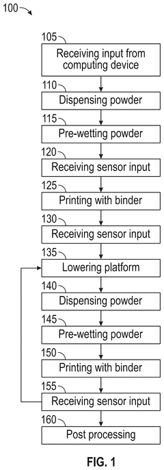Implementing sophisticated control and monitoring systems for binder jetting parameters enhances process reliability. These systems continuously track critical variables such as printhead temperature, binder viscosity, droplet volume, and powder bed characteristics. Real-time feedback mechanisms allow for automatic adjustments to maintain optimal printing conditions. Advanced monitoring technologies may include optical systems for layer inspection, thermal sensors for curing verification, and predictive algorithms that anticipate potential failures before they occur, resulting in more consistent part quality.Expand Specific Solutions03 Powder characteristics and handling improvements