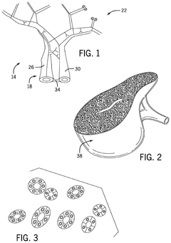 Microfluidic technologies enable the creation of precisely controlled vascular networks within biomimetic scaffolds. These approaches allow for the formation of perfusable channels with defined geometries that mimic native vasculature. By incorporating endothelial cells into these microfluidic systems, functional blood vessels can be developed within the scaffold. This technology facilitates nutrient and oxygen delivery throughout thick engineered tissues, overcoming diffusion limitations and enhancing tissue viability.Expand Specific Solutions03 Growth factor delivery systems for enhanced vascularization