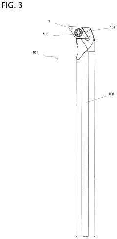 Technical Solution: Mitsubishi Materials has pioneered the MB8025 and MBC010 series of cBN cutting inserts specifically engineered for extreme cutting speeds. Their technology utilizes a proprietary "Particle Activated Sintering" method that creates an ultra-fine grain structure with exceptional hardness (over 40 GPa) while maintaining adequate toughness. The company's approach involves a specialized two-layer structure: a thick cBN layer bonded to a tough carbide substrate that provides mechanical support while allowing for complex insert geometries. Mitsubishi's inserts feature precisely engineered micro-geometries at the cutting edge, including controlled honing and negative rake designs that distribute cutting forces optimally during high-speed operations. Their latest innovation incorporates nano-laminated PVD coatings with alternating layers of TiAlN and TiN that act as thermal barriers and reduce friction at the tool-chip interface. This technology enables sustained cutting speeds of up to 1500 m/min when machining hardened steels and superalloys, with documented edge temperature reductions of approximately 200°C compared to conventional cBN tools.