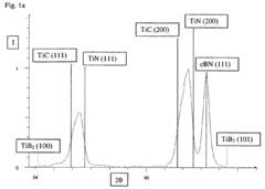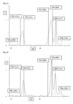 Various manufacturing processes can be employed to enhance the edge strength of boron nitride cutting inserts. These include high-pressure high-temperature (HPHT) sintering, hot isostatic pressing, and specialized heat treatment processes. The manufacturing parameters such as sintering temperature, pressure, and cooling rate significantly affect the microstructure and consequently the edge strength of the cutting inserts. Advanced manufacturing techniques can create more uniform microstructures with fewer defects, resulting in superior edge strength.Expand Specific Solutions03 Coating technologies for boron nitride cutting inserts
