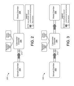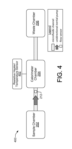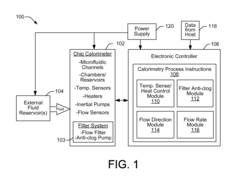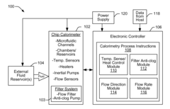 - Integration of micro-inertial pumps within the chip calorimeter for precise control over fluid flow rates and directions, coupled with on-chip filtering systems to prevent clogging and adapt to various sample fluids, enabling accurate and efficient sample handling and measurement.