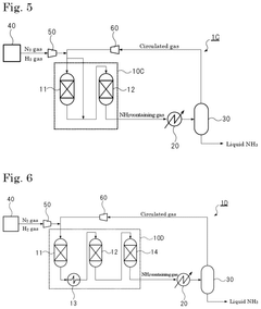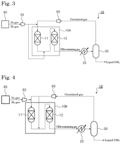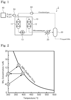 Ammonia synthesis provides an effective solution for energy storage and transportation challenges. As a hydrogen carrier, ammonia can store renewable energy in chemical form, offering higher energy density than compressed hydrogen. It can be easily liquefied for transport using existing infrastructure and later converted back to hydrogen or used directly as fuel. This makes ammonia an attractive option for long-term energy storage and for transporting energy across long distances, supporting the transition to renewable energy systems.Expand Specific Solutions05 Technological innovations in ammonia synthesis
