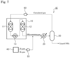 - The system employs a reaction pressure of 10 MPa or less and an ammonia gas concentration of 3% by volume or more in the circulated gas, using multiple reactors connected in series and a heat exchanger to optimize ammonia synthesis.