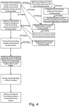 Proper surface preparation is essential for achieving high-quality diffusion bonds with excellent hermeticity. Techniques include mechanical polishing, chemical etching, plasma cleaning, and ion bombardment to remove oxides and contaminants. Some processes incorporate interlayers or coatings to facilitate bonding between dissimilar materials. Surface roughness control at the micro and nano scales can significantly improve bond strength and hermeticity by increasing the effective contact area.Expand Specific Solutions05 Specialized diffusion bonding for electronic and aerospace applications