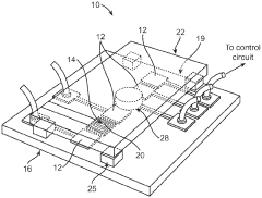 Reconfigurable and addressable electrode arrays in microfluidic chips provide dynamic control over electric field distributions, enabling adaptive manipulation of fluids and particles. These systems typically consist of individually addressable electrode elements that can be selectively activated to create customizable electric field patterns. The reconfigurability allows for multiple operations to be performed sequentially on the same device, such as mixing, separation, and detection, without requiring physical reconfiguration of the chip. Advanced control systems and multiplexing techniques are employed to manage complex electrode arrays for applications in digital microfluidics and adaptive lab-on-chip systems.Expand Specific Solutions