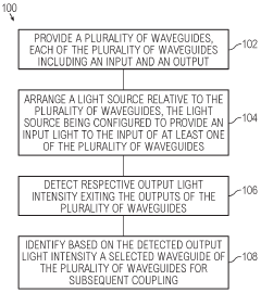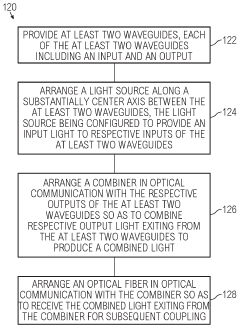 - An alignment method involving multiple silicon waveguides arranged in parallel with a light source, such as a laser diode, to enhance alignment tolerance and coupling efficiency by using a combiner to combine light from multiple waveguides into an optical fiber.
