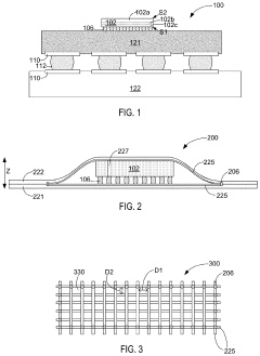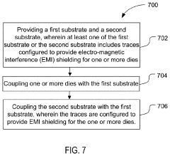 - The use of substrates with traces configured in a grid arrangement to provide EMI shielding, where one substrate is rigid and the other is flexible, allowing for a reduction in z-height and form factor, and potentially integrating additional functionalities like solar panels or displays, with interconnect structures forming a Faraday cage around the die.