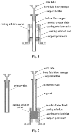 Multi-layer and composite hollow fiber membranes combine different materials to achieve enhanced selectivity. These structures typically feature a thin selective layer supported by a more porous substrate, allowing for optimization of both selectivity and permeability. The thin selective layer provides the separation capability while the support layer offers mechanical strength. This approach enables the creation of membranes with tailored separation properties for specific applications, such as gas separation, water purification, or biomedical processes.Expand Specific Solutions05 Operating conditions and process parameters for selectivity control