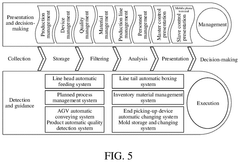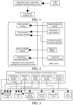 - An unmanned intelligent manufacturing system integrating an ERP system, unmanned stamping line, material data modules, scheduling planning modules, and an AGV system, which includes modules for material inventory, quality detection, and visualization, enabling automatic production and resource allocation.