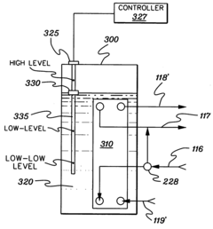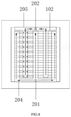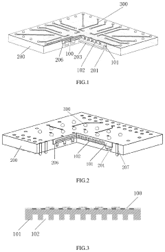Technical Solution: Intel has developed a sophisticated two-phase immersion cooling technology specifically engineered to address 1 kW+ chip heat flux challenges in their high-performance processors. Their solution utilizes a custom-formulated dielectric fluid with optimized thermophysical properties that undergoes controlled phase change at the chip surface. Intel's approach incorporates precision-engineered microporous wicking structures directly integrated with the chip package, creating capillary action that ensures continuous fluid supply to high heat flux regions even during intense boiling regimes. To prevent flow instabilities, Intel implements a hierarchical cooling structure with primary distribution channels feeding into secondary microchannels, maintaining pressure equilibrium across the cooling system[5]. Their technology includes specialized vapor extraction pathways that efficiently remove vapor without interfering with incoming liquid flow, preventing the vapor blanketing effect that typically causes thermal runaway at extreme heat fluxes. Intel has also developed advanced surface treatments that promote nucleate boiling while suppressing the transition to film boiling, extending the critical heat flux limit significantly beyond conventional systems. The cooling solution incorporates embedded temperature and pressure sensors that feed into a predictive control system, which can anticipate and prevent instability conditions before they develop[6].