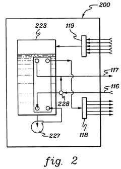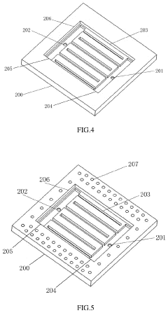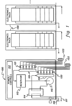 Technical Solution: IBM has developed an advanced two-phase liquid cooling solution specifically designed to address 1 kW+ chip heat flux challenges. Their system utilizes a combination of direct liquid cooling with engineered microchannels etched directly into silicon interposers that sit beneath high-performance chips. This approach creates a highly efficient thermal interface with minimal thermal resistance. IBM's solution employs a carefully engineered manifold distribution system that ensures uniform coolant flow across the entire chip surface, preventing localized hotspots and flow instabilities. The system uses dielectric fluids with optimized boiling points that undergo phase change (liquid to vapor) directly at the chip surface, extracting maximum heat through latent heat of vaporization rather than sensible heat alone. IBM has implemented sophisticated pressure control mechanisms and microporous flow stabilizers to prevent flow instabilities like vapor lock or critical heat flux conditions that typically occur at extreme heat loads[1][3]. Their system includes real-time monitoring with embedded sensors that can dynamically adjust coolant flow rates based on workload demands.