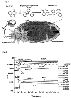 - Development of a method using chemiluminescent agents with mitochondrial affinity, specifically modified luminol conjugates, that act as an intracellular light source, activating photosensitizers like PpIX within cancer cells to produce cytotoxic singlet oxygen without the need for external light, allowing targeted treatment of hyperproliferative cells and deep-seated tumors.