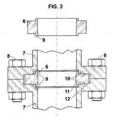 - A sealing system utilizing a solid, flat ring with a radial wedge-shaped incision around its outer circumference, made from soft metals or alloys with Mohs hardness between 1 and 3, which deforms plastically under pressure to create a strong radial sealing force on surfaces perpendicular to the pressing direction, reducing the need for surface smoothness and additional lubricants.