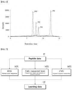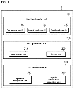 - A system employing machine learning models, including RNNs and CNNs, to predict spectral profiles of peptides by analyzing amino acid sequences, charges, mass, and fragmentation information, generating learning data for accurate peak prediction and noise reduction.