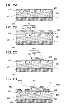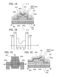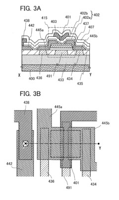 Technical Solution: Semiconductor Energy Laboratory (SEL) has pioneered advanced oxide semiconductor technology, particularly focusing on In-Ga-Zn-O (IGZO) thin-film transistors. Their approach involves precise control of oxygen vacancies in the semiconductor structure to modulate electrical conductivity and carrier mobility. SEL has developed proprietary crystallization techniques that enable the formation of c-axis aligned crystalline IGZO (CAAC-IGZO) with significantly reduced oxygen vacancy fluctuations[1]. This technology allows for unprecedented stability in electrical properties while maintaining high optical transparency (>80% in visible spectrum). Their process includes specialized annealing methods in controlled oxygen atmospheres to fine-tune the semiconductor's band gap (typically 3.0-3.5 eV), which directly impacts both optical transparency and electrical performance. SEL has successfully implemented these oxide semiconductors in display applications, achieving electron mobility exceeding 10 cm²/Vs while maintaining extremely low off-state current (<10^-13 A)[2].