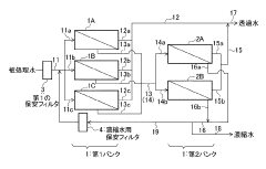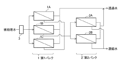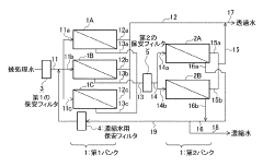 Membrane fouling significantly reduces flux and can impact rejection performance of RO systems. Various techniques have been developed to prevent fouling, including pretreatment of feed water, surface modifications to create anti-fouling membrane properties, and optimized hydrodynamic conditions. Effective cleaning protocols using chemical agents and physical methods can restore membrane performance when fouling occurs, extending membrane life while maintaining desired flux and rejection characteristics.Expand Specific Solutions04 Membrane module design and system configuration