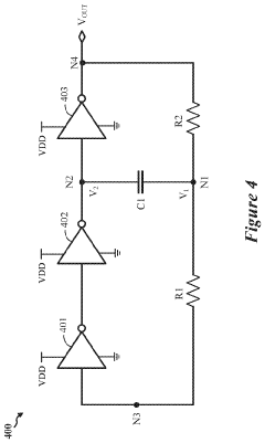 - A programmable ring oscillator incorporating a Schmitt trigger, CMOS inverters, resistors, and a capacitor, where the Schmitt trigger provides input hysteresis with threshold voltages adjustable based on supply voltage and configuration signals to maintain a constant oscillation frequency, reducing the impact of voltage variations.