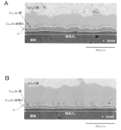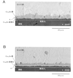 - A Sn-Cu-Ni-Bi-Ge-based lead-free solder alloy is used, with specific weight percentages of Cu, Ni, Bi, and Ge, along with optional additions of Sb, In, Ga, Ag, P, Mn, Au, Zn, Co, Ti, and Al, to suppress the formation and growth of these intermetallic compounds, maintaining low electrical resistivity even under high-temperature aging.