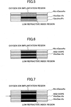 - The development of a surface-emission laser diode with a current confinement structure formed by selective oxidation or ion implantation, incorporating a region with a low refractive index oxide of Al, and a distributed Bragg reflector made of semiconductor materials, allowing for effective current injection and reduced device resistance, along with an antiguiding structure formed by oxygen ion implantation and thermal annealing, which enhances design freedom and suppresses higher-order transverse modes.