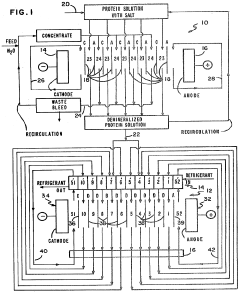 Technical Solution: Life Technologies has pioneered a comprehensive approach to pH stability in isoelectric focusing through their ZOOM IEF Fractionator system. This technology employs specialized membrane disks with precise pH values to create discrete pH compartments, effectively eliminating the continuous pH gradient that traditionally suffers from drift and instability[1]. Their innovation includes proprietary buffer formulations containing optimized concentrations of non-detergent sulfobetaines (NDSB) and glycerol that significantly reduce protein aggregation while enhancing pH stability during extended focusing times[2]. The company has developed a patented electrode design that minimizes electrolysis effects at the electrode-buffer interface, reducing pH fluctuations caused by water electrolysis and subsequent ion migration. Life Technologies' system incorporates real-time pH monitoring capabilities through integrated microelectrodes that provide continuous feedback on pH conditions throughout the separation process, allowing for automated adjustments to maintain stability[3]. Additionally, their approach includes specialized cooling systems that maintain uniform temperature distribution across the separation chamber, preventing thermal gradients that could disrupt pH stability.