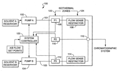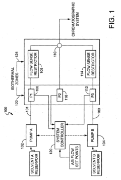 Temperature fluctuations can significantly impact HPLC flow stability by affecting mobile phase viscosity and column backpressure. Specialized temperature control systems maintain consistent thermal conditions throughout the chromatographic system, including column compartments, mobile phase reservoirs, and flow paths. These systems employ precise heating/cooling elements, thermal insulation, and temperature sensors to ensure stable flow characteristics and reproducible retention times during analysis.Expand Specific Solutions03 Mobile phase composition and degassing techniques