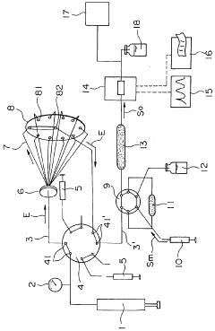 The composition and preparation of mobile phases significantly affect HPLC flow stability. Proper degassing techniques remove dissolved gases that can form bubbles and disrupt flow consistency. Methods include helium sparging, vacuum degassing, and online degassing modules. Additionally, careful selection of solvent mixtures with compatible physicochemical properties and appropriate buffer systems helps maintain homogeneous flow characteristics and prevents precipitation or phase separation that could obstruct flow paths.Expand Specific Solutions04 Pressure regulation and pulsation dampening