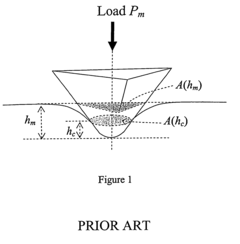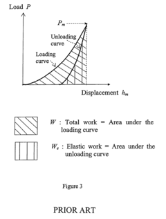 - A method using a Berkovich indenter modeled with a conical shape and spherical cap, where the cross-sectional area is constant with depth, allowing for the calculation of elastic modulus without relying on the initial unloading slope, by correlating nominal hardness and elastic work to total work through numerical simulations and interpolation, considering indenter bluntness.