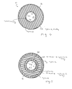 - Elastic modulus modification through blending and copolymerization: The elastic modulus of Nylon 66 can be modified through polymer blending and copolymerization techniques. Blending Nylon 66 with other polymers such as elastomers can reduce the elastic modulus for applications requiring flexibility, while blending with stiffer polymers can increase it. Copolymerization with different monomers allows for tailoring the elastic modulus by changing the chemical structure and crystallization behavior of the resulting material.