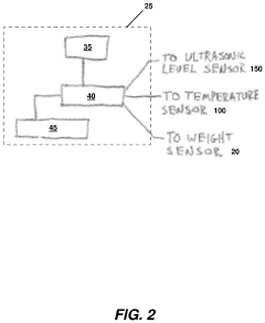 - Implementing a weight-based monitoring system using a sensitive load cell or scale to detect subtle changes in container weight, combined with optional temperature and ultrasonic level sensors, to provide real-time data analysis and alert systems for leak detection and prediction.