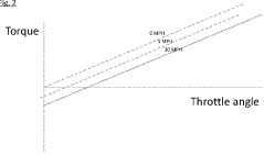 - An electric motor system that varies driving torque based on throttle angle, setting zero torque at zero throttle angle, which adjusts with vehicle speed, allowing immediate response to throttle changes even at low speeds, and incorporating regenerative braking for smooth acceleration and deceleration without requiring throttle adjustments.