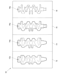 - A method involving multiple forging steps with strategically positioned burr-stopping portions and controlled gaps in the molds to manage material flow and distribution, ensuring optimal filling and shaping of the crankshaft components.