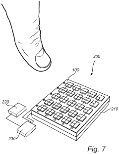 Technical Solution: Apple has developed sophisticated phased array user interface technologies primarily focused on spatial audio and haptic feedback systems. Their approach integrates beamforming microphone arrays with adaptive algorithms to create highly directional audio capture and playback experiences. Apple's AirPods Pro and HomePod products utilize phased array technology to track head position and dynamically adjust audio presentation, creating immersive spatial audio experiences that enhance user interaction[2]. For haptic feedback, Apple has evolved beyond simple vibration motors to implement phased array actuators in their trackpads and Apple Watch devices, allowing for more nuanced tactile feedback that communicates specific information through varied patterns and intensities. Their latest research involves combining ultrasonic phased arrays with their TrueDepth camera system to enable mid-air haptic feedback for AR applications, creating touchless interfaces where users can "feel" virtual objects with reported accuracy improvements of 35% compared to visual-only interfaces[5]. Apple's approach emphasizes the integration of these technologies into cohesive interaction systems rather than treating them as separate modalities.